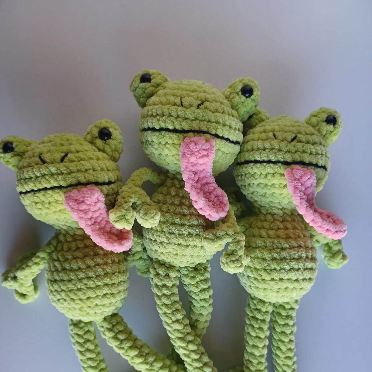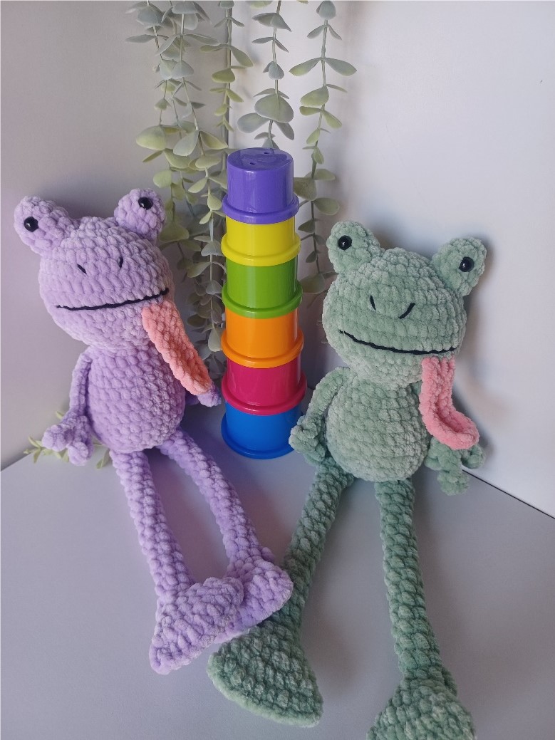 Handcrafted with ultra-soft plush yarn, each frog is designed to be as cozy as it is adorable. With its sweet expression, long floppy legs, and playful pink tongue, this charming frog is full of personality and sure to bring a smile to anyone who meets it.