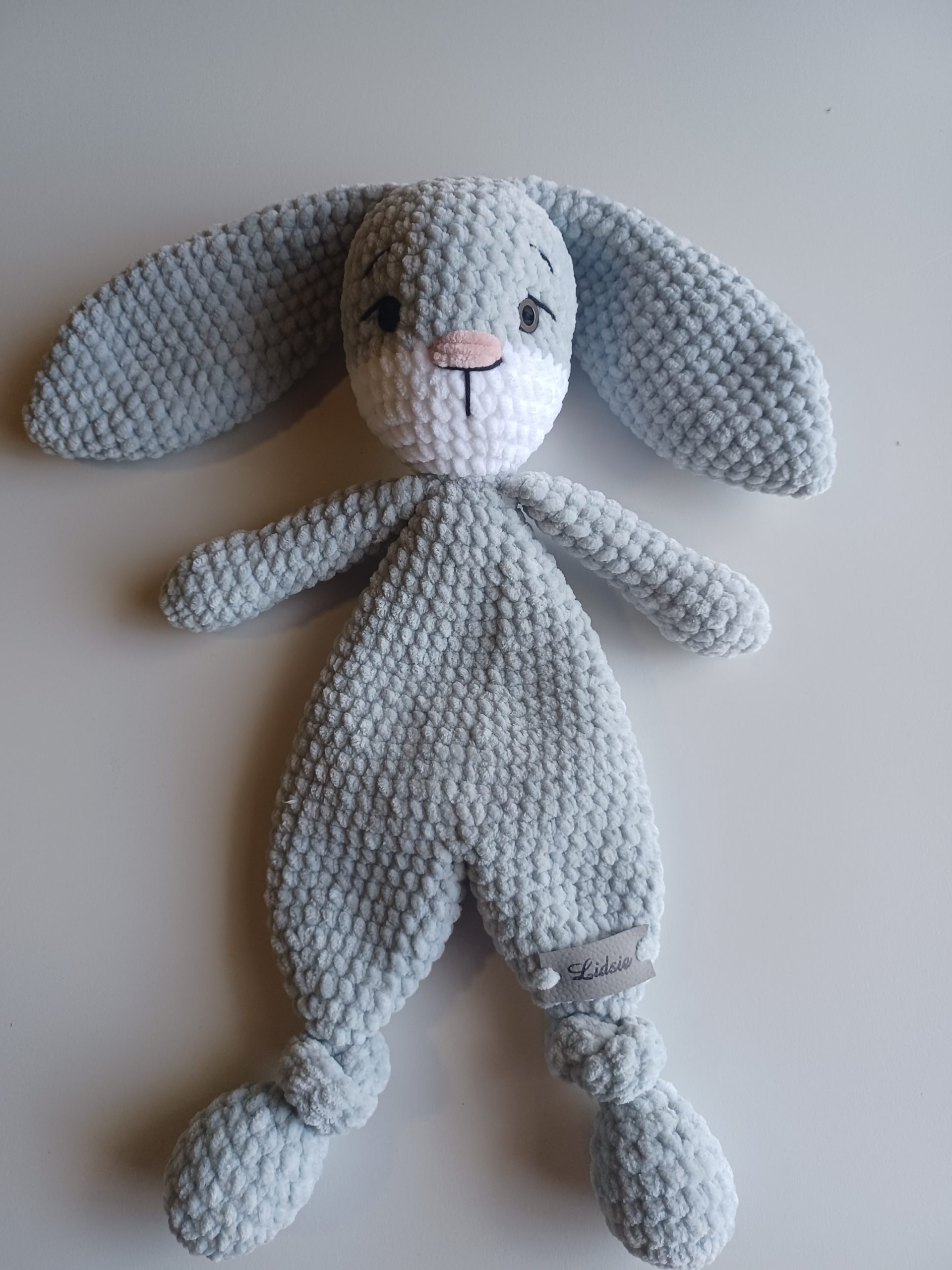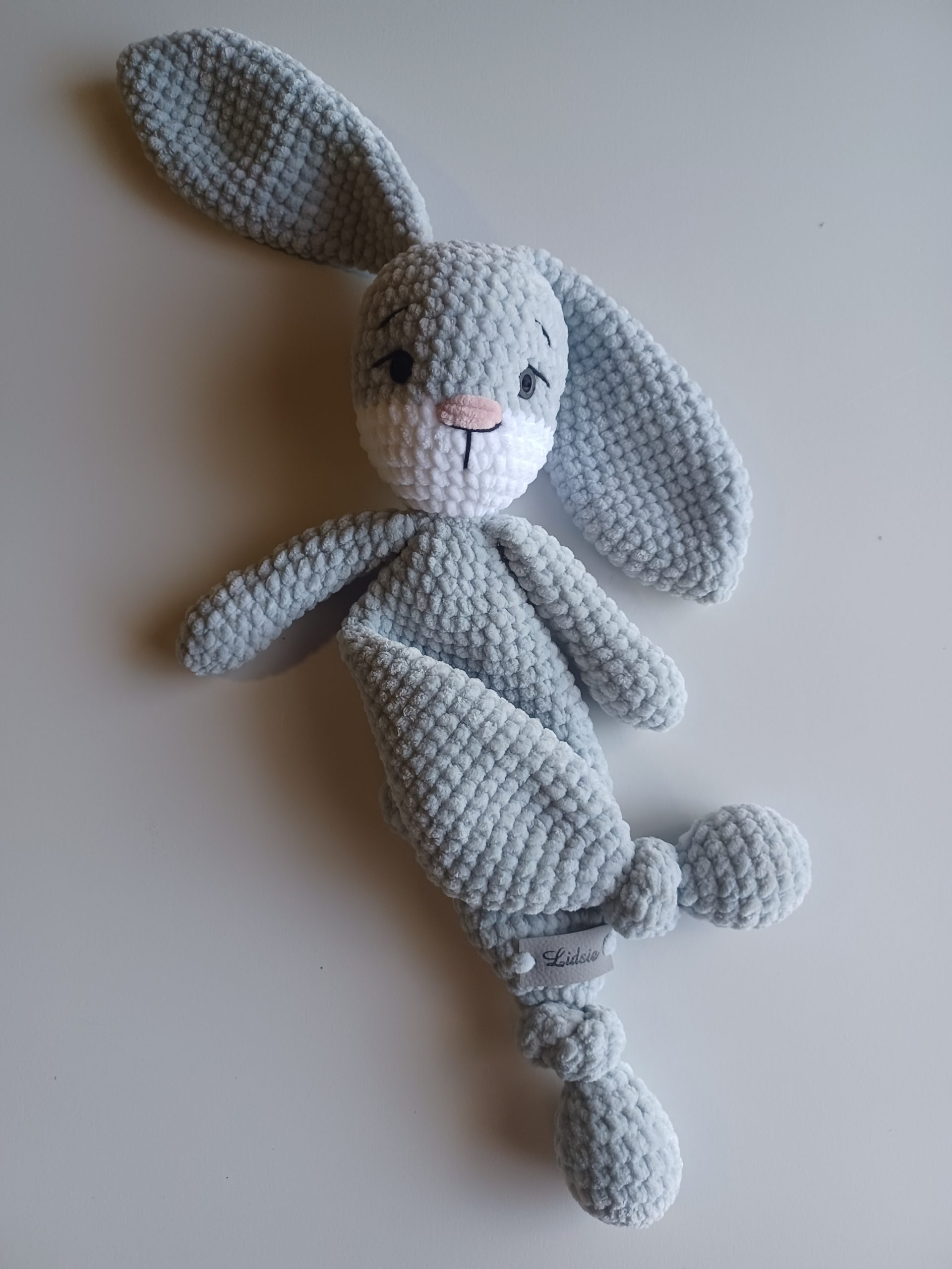Lovingly crocheted with luxuriously soft plush yarn, this bunny is designed with a lightweight snuggle body and long floppy ears, making it easy for tiny hands to hold, cuddle, and carry everywhere. Its gentle, calming presence makes it ideal for nap time, bedtime, or comforting moments throughout the day.